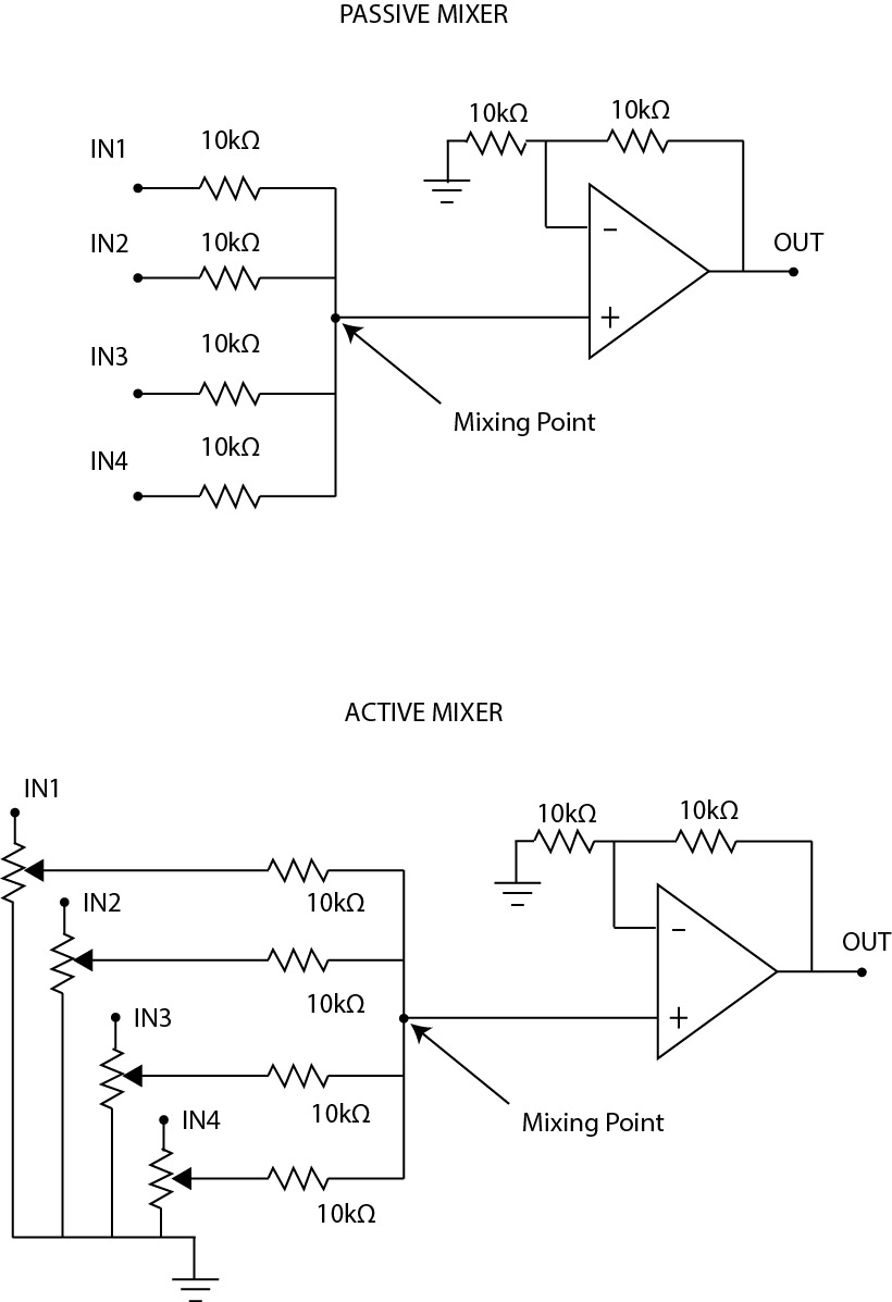 These Circuits sums audio signals of multiple sources. There are passive and active mixers.
