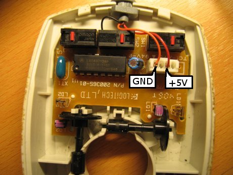 The mouse needs to be powered by a 5V source. On the picture below, the orange cable (left cable) is the 0V (GND) and the red one(right cable) is the +5V. You can either remove the female connector and solder your cables on the male connector or (like I did) use the original connector.