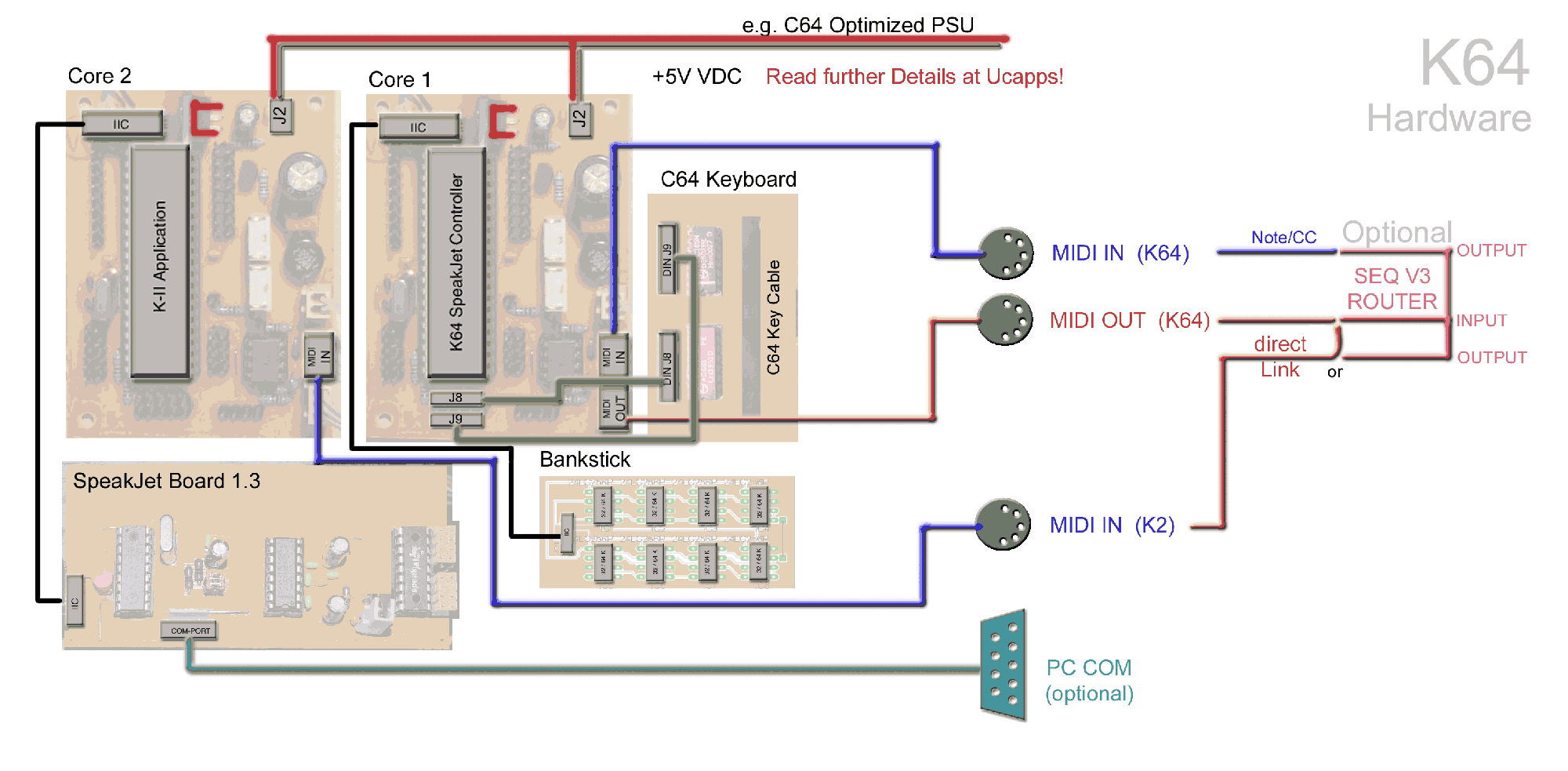 Please read all information about PSU, PCB Boards (CORE, SpeakJet / K2, C64 Keyb etc.) at MIDIBOX WIKI and Ucapps.de. See links above.