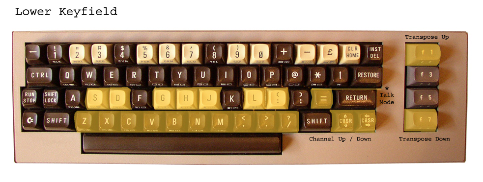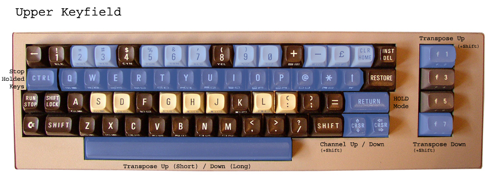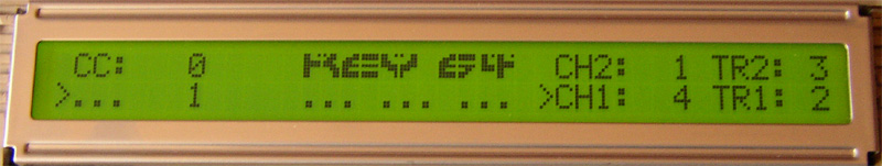On the right side of screen the adjustable channel- and transpose-values for UPPER and LOWER keyfield are shown. CH1 (for LOWER keyfield) can be changed with CRSR keys up down, CH2 (for UPPER keyfield) is variable by + and -. Pushing F1 and F7 will change the transpose value (TR1). For the UPPER Keyfield TR2 is adjustable in 2 ways: Pushing SHIFT_R + F1 and SHIFT_R + F7 or pushing simply the SPACE key. A short touch of the space button transposes TR2 up, a longer touch transposes TR2 down. All Parameters will be stored internal.