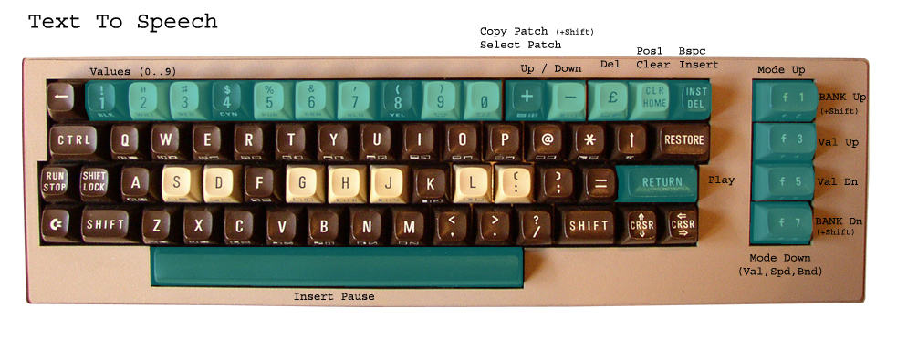 CTRL select Keyboard Mode A..Z Write Letters SPACE Write Pause (Space) RETURN play/send current speech text
