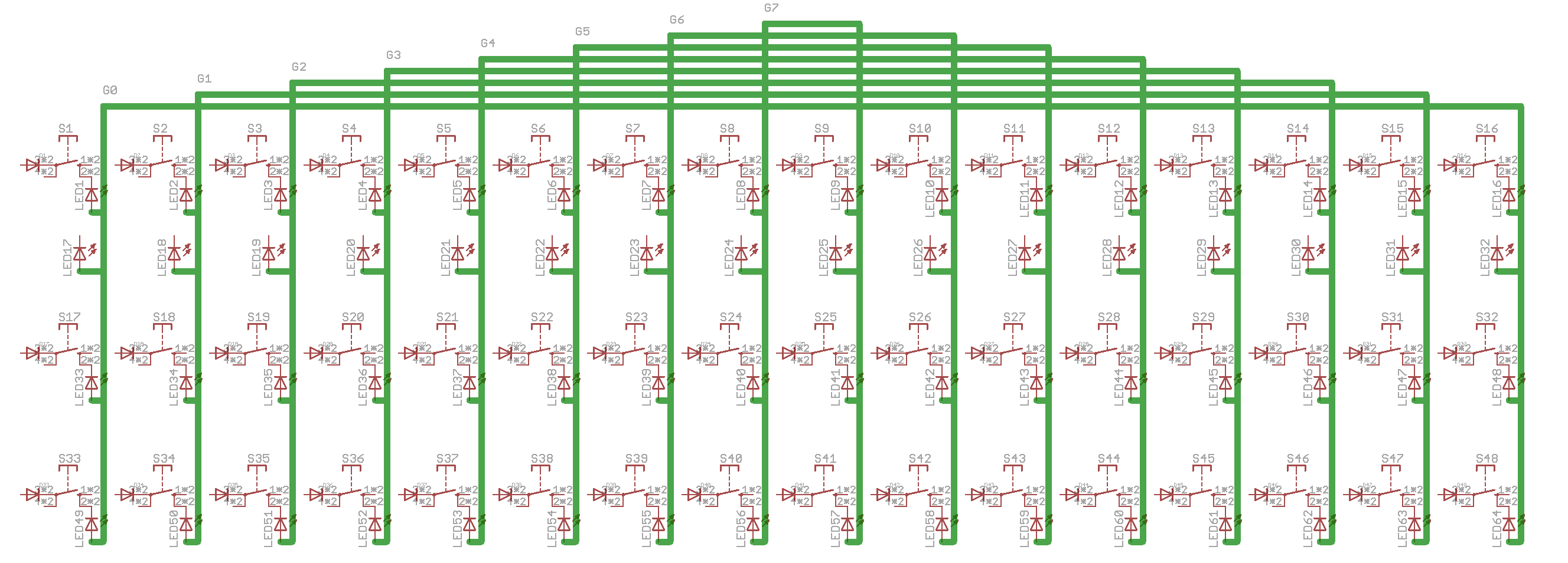 The circuit is merely a single colour 8*8 BLM (button LED matrix) arranged as a 16*4 with one row of switches left out. Normally a different colour LED will be used to indicate steps. A J8/9 connector carries the SRIO chain for 2* 74HC595 and 1* 74HC165 chips (with coupling capacitors). No current sink transistors are used. The remaining components are diodes on every switch to avoid false triggering, pull up resistors for the DIN inputs and current limiting resistors for LEDs.