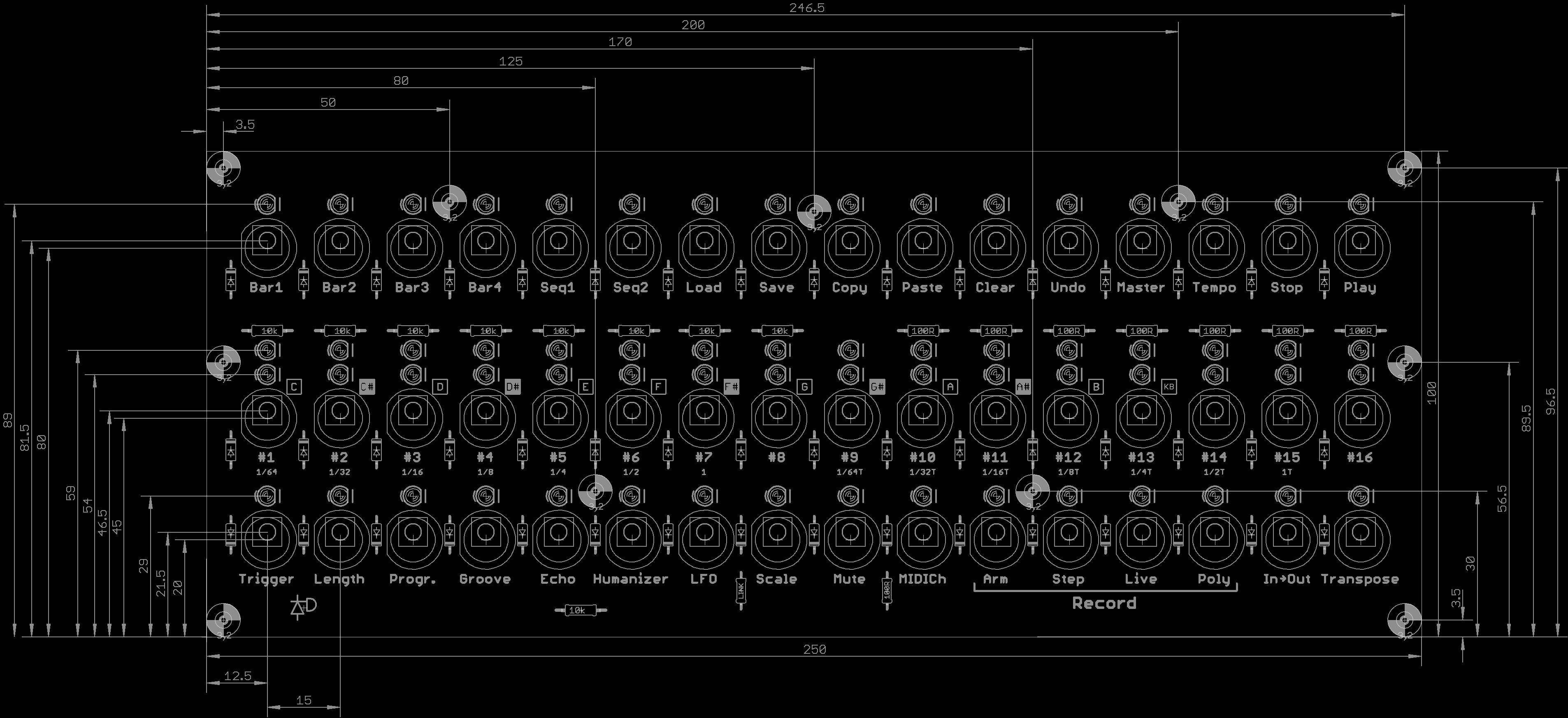 Front + dimensions (in mm) of switches, LEDs and mounting holes (M3)