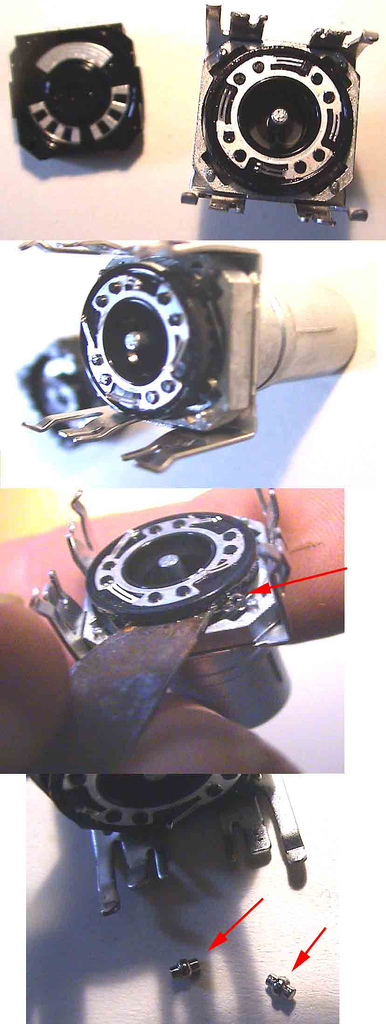 - Bend down (or up, depending on your perspective) the half-circle thingie. (You may choose to flatten the nub, or bend down the metal half-circle. Or you could even go so far as to separate the white plastic from the metal bottom and remove the detent disc completely with no fuss. It snaps right back together (pic coming). Either way will accomplish the job. The point is to move the metal nub that falls into the valleys on the spinning disk.)