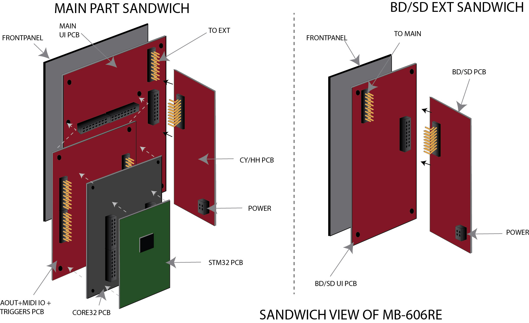 The MB-606RE is a re-edit of CYM/HH and BD/SD drum parts of the Roland TR-606 to be controlled via MIDI (midibox) or CV through analog-Sequencers , in a a Eurorack-designed panel.