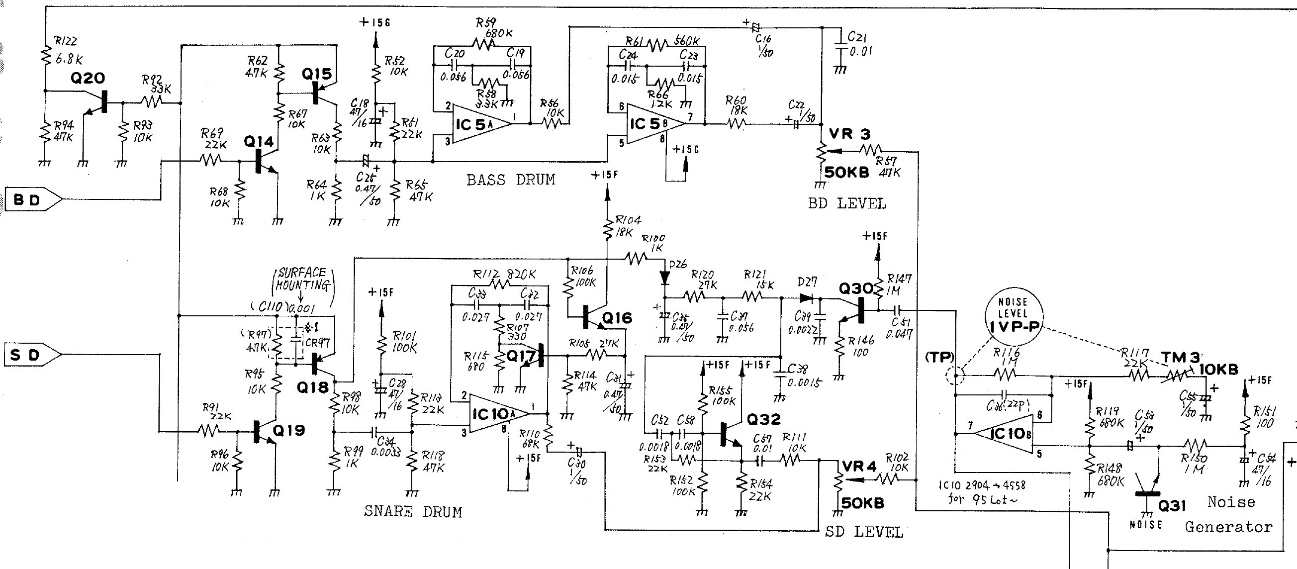 * HH Noise: 10K or 50K lin or log,have to check , orginally 10K trimpot, only change volume not to absolutely silence.