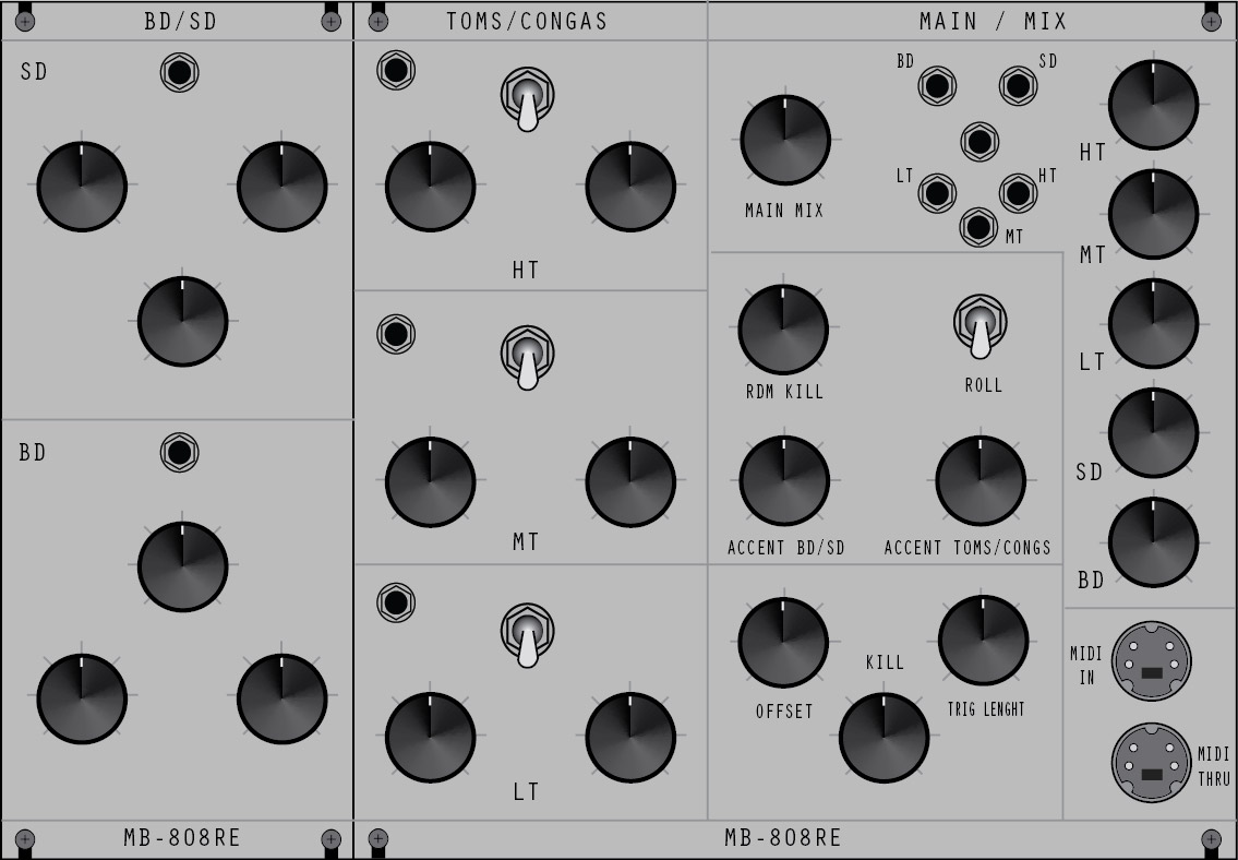 The MB-808-RE is a re-edit of TOMS/CONG and BD/SD drum parts of the Roland TR-808 to be controlled via MIDI or CV in a a Eurorack-designed panel.It bases upon the work done on MB-606RE