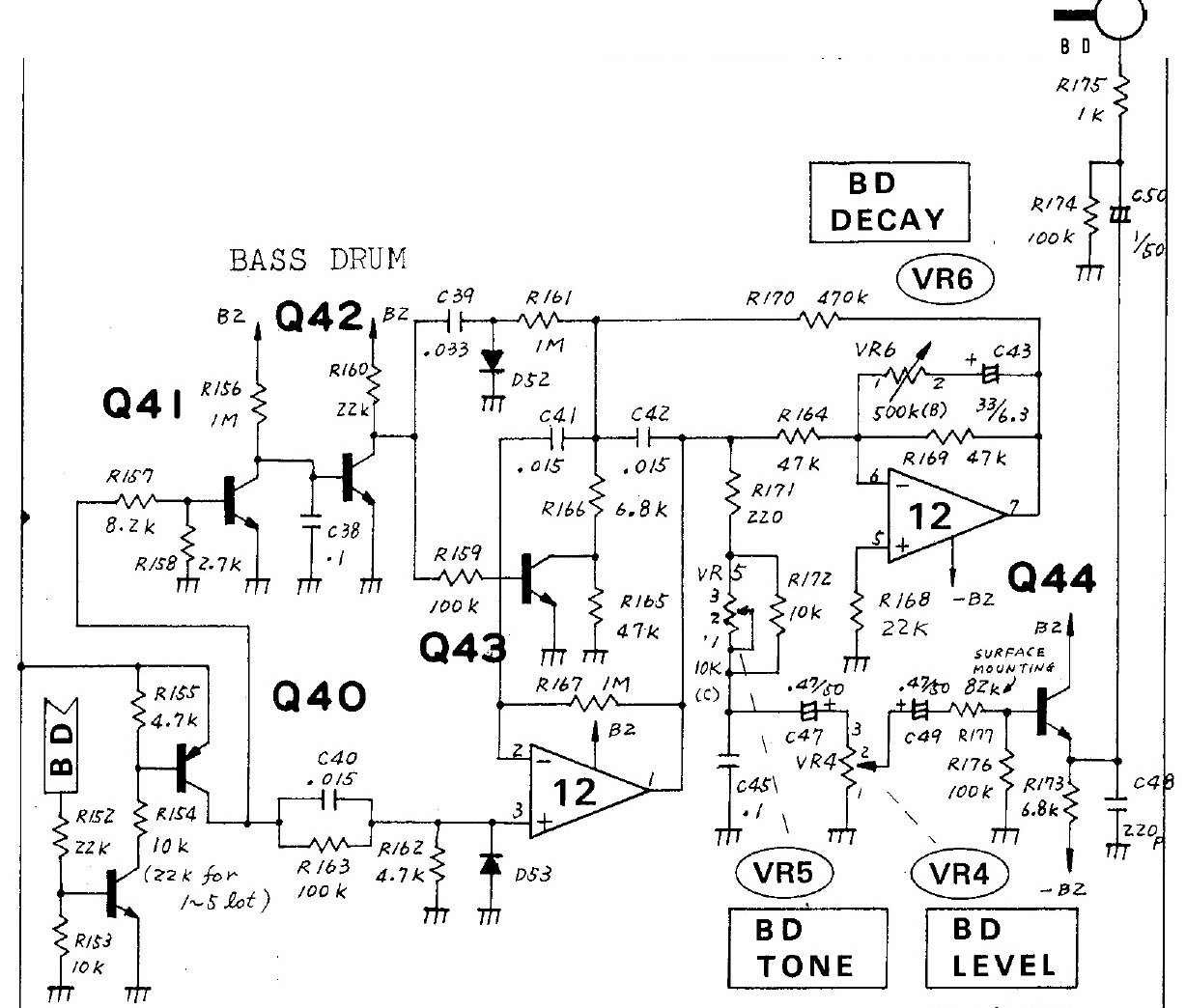 changed R170 (470k) to resistor (380k) with a trimmer (100k) in series for adjustment of longest possible decay put an analog switch between decay-pot and C43 to switch between 2 different decays. The sequencers BD-steps have 3 states which are rotated each time you press the step-button: OFF with LED off, ON with LED on and variable decay (from the pot), ON with LED flashing and fixed short decay. Of course the short BD cuts off the long. Snaredrum