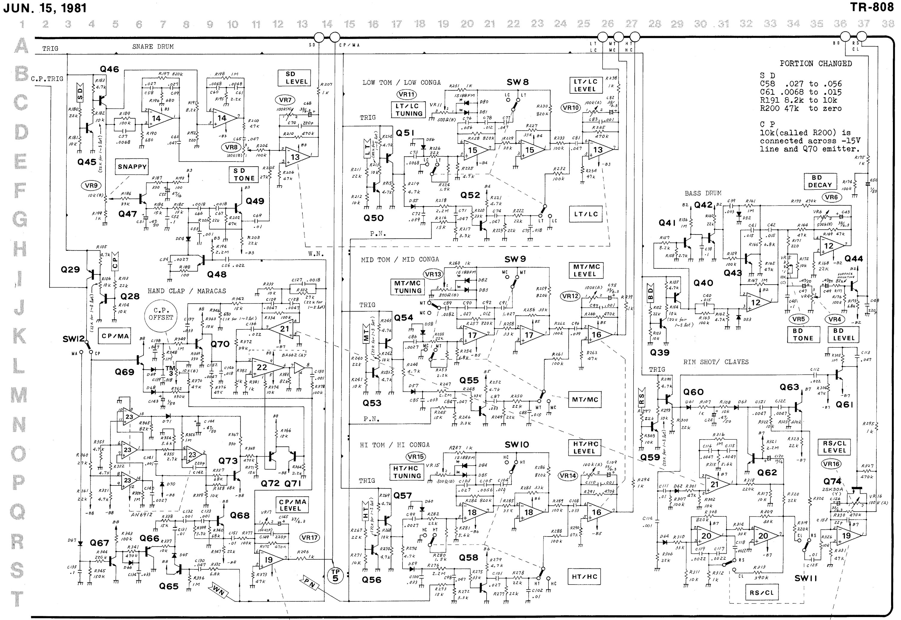 Tune for lower oscillator – R116 is replaced with 1M-Pot and 220k in series. The lower oscillator can be tuned then. The 220k will prevent bad sound in extreme potpositions. You also can take 2.2 MB-pot but beyond the 1M there wont happen too much. Noisefilter – R22 is replaced by 50k-Pot and 4.7k in series. Again the 4.7k prevents weird sounds. Noisedecay – i put a 10k-pot in parallel to C37. It is not the badest idea to have a socket for C37. Now you can replace it with different values for testing what you like most without soldering. To high values (>2,2µ) will result in slow loading time, you would loose the punchy attack TR606-pitch envelope for both oscillators just copied the tr606-SD-scheme 2 times, one for each oscillator the TR606-pitch envelope – when used – tunes the already hightuned oscillator 1 even higher. I changed C32/C33 (6.8n) into 10n and put some sockets for experimenting with different capacitor values witout the need for soldering. after building the noiseunit i was not happy with the sound. no matter how this 20k-pot was set, the white noise somehow sounded ‘granular’, not white. I changed the 100k-resistor at the opamp-input (R280) into a 5k-pot, much better now.
