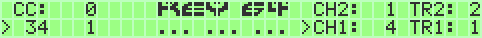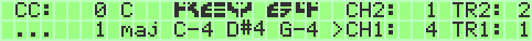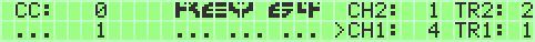 On the right side of screen the adjustable channel- and transpose-values for UPPER and LOWER keyfield are shown. CH1 (for LOWER keyfield) can be changed with CRSR keys up down, CH2 (for UPPER keyfield) is variable by + and -. Pushing F1 and F7 will change the transpose value (TR1). For the UPPER Keyfield TR2 is adjustable in 2 ways: Pushing SHIFT_R + F1 and SHIFT_R + F7 or pushing simply the SPACE key. A short touch of the space button transposes TR2 up, a longer touch transposes TR2 down. All Parameters will be stored internal.