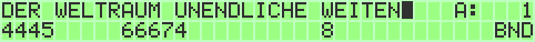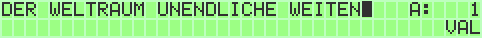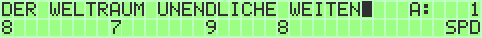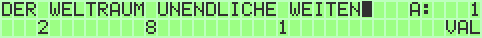 The upper line is for writing input (max. 32 characters for patches are allowed). A space character will insert a pause. The cursor can be moved by CRSR Keys to a special position in word. On the left side you can choose the current bankstick (SHIFT_R + F1 / SHIFT_R + F7) and the current patchnumber (+ / -). The lower line represents different configurations for every letter.