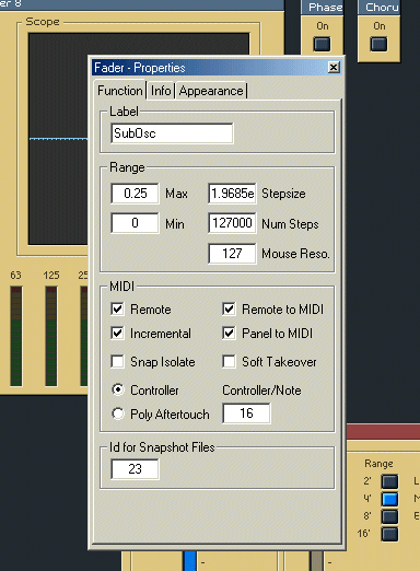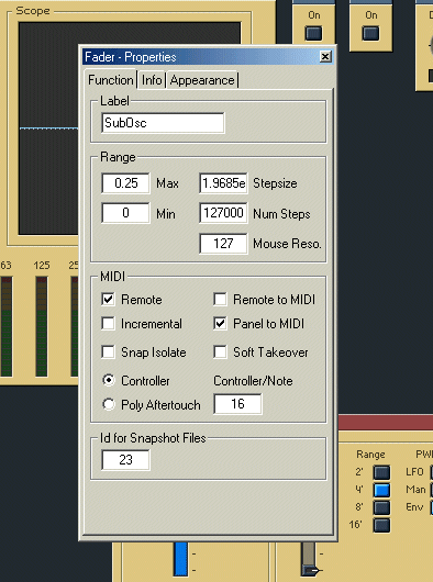 Pots/Faders or Encoders in absolute mode: best choice if you control the virtual instruments not only with MIDIbox64E, but also with MIDIbox64 or any other MIDI controller which sends absolute values. The parameter “SubOsc” is assigned to Controller Bn 10 xx (10 hex = 16 dec), Remote is enabled, panel to remote is also enabled for the feedback, so that the absolute value will be updated when you move the fader with the mouse: