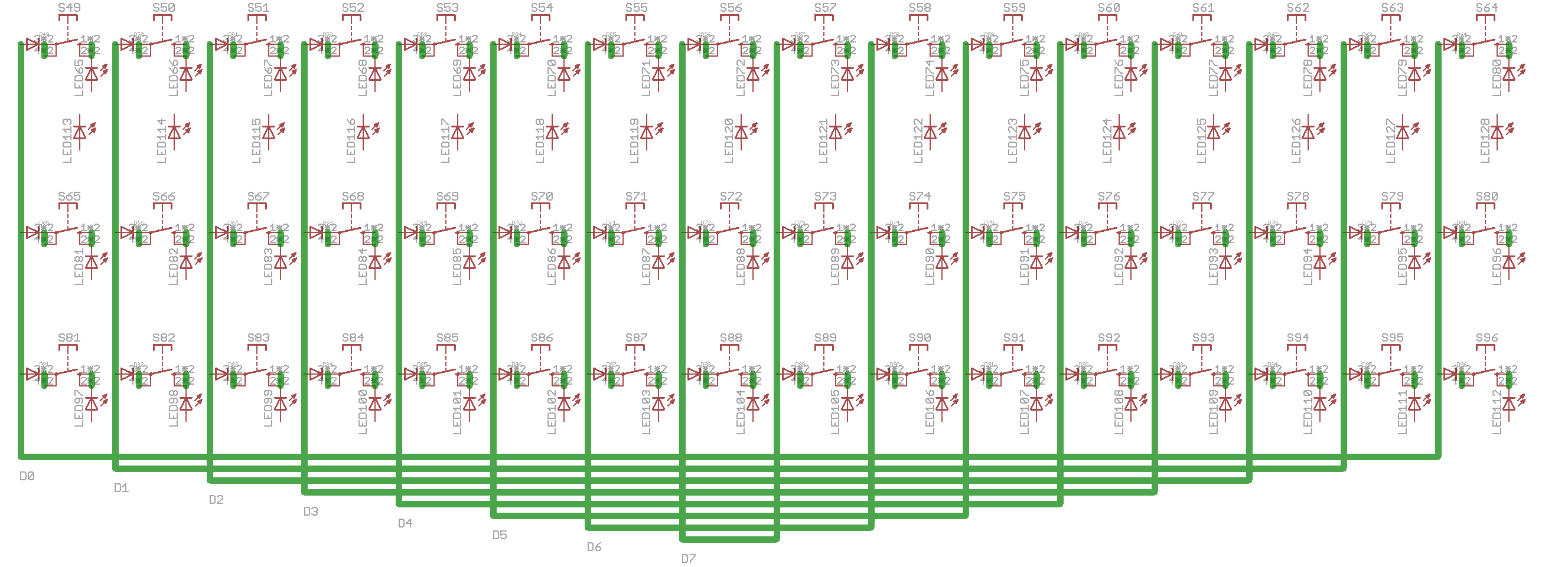 The circuit is merely a single colour 8*8 BLM (button LED matrix) arranged as a 16*4 with one row of switches left out. Normally a different colour LED will be used to indicate steps. A J8/9 connector carries the SRIO chain for 2* 74HC595 and 1* 74HC165 chips (with coupling capacitors). No current sink transistors are used. The remaining components are diodes on every switch to avoid false triggering, pull up resistors for the DIN inputs and current limiting resistors for LEDs.