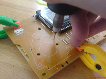 Drilling the new PCB using the old PCB as template. Doing so you achieve a perfect fit of your PCB into the unit. Don't forget to drill the mounting holes too. I am using clamps to keep the two boards aligned during the process